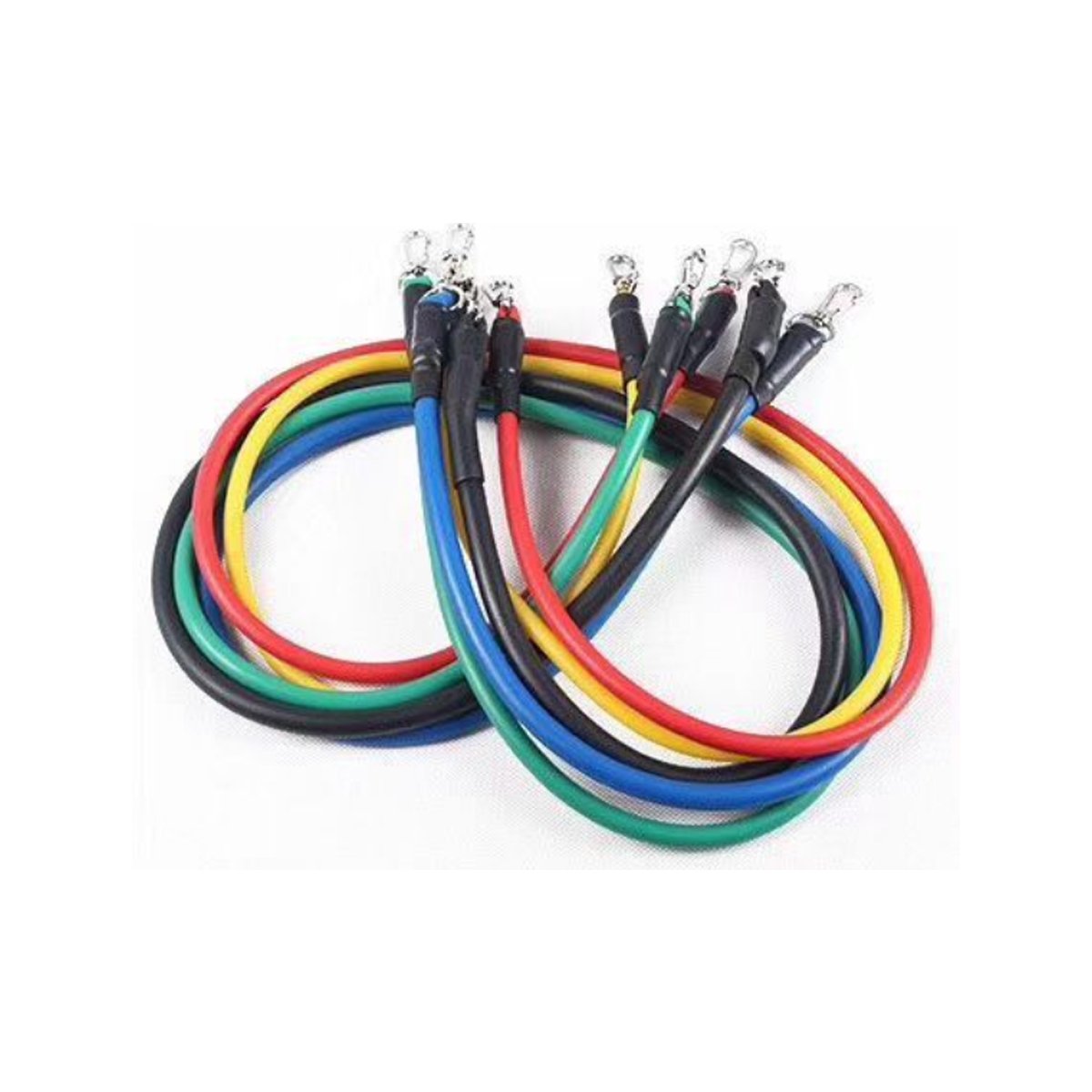 - Stackable bands for adjustable resistance levels. Comes as a set of 5, 48-inch long colored exercise bands. Yellow, Red, Green, Black, and Blue bands can also be combined together to provide up to 120 lbs of resistance. The metal clip system allows you to attach the included soft-grip handles or ankle straps for a more comfortable workout.