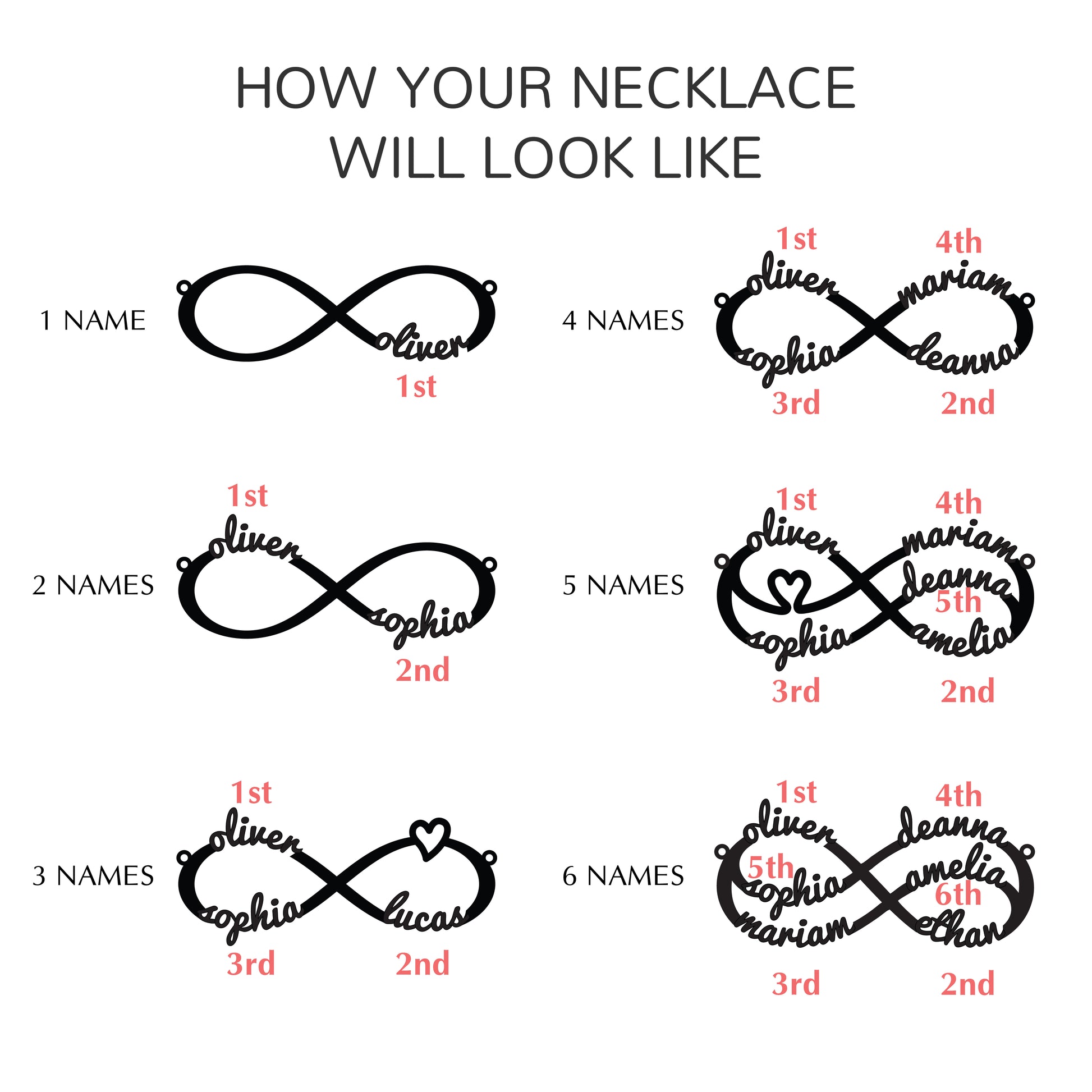 Customize this piece with your choice of 1-4 names to symbolize your everlasting love. This bracelet design is fully adjustable and flexible enough by pulling on the string ends on each side of the slip knot, as needed to fit most wrist sizes.