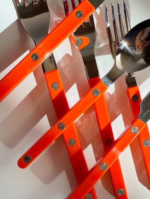 Constructed with high quality stainless steel, these sleek retro cutlery sets feature a dopamine design and contribute to a playful table setting for your backyard wine gathering or summer time dinner party