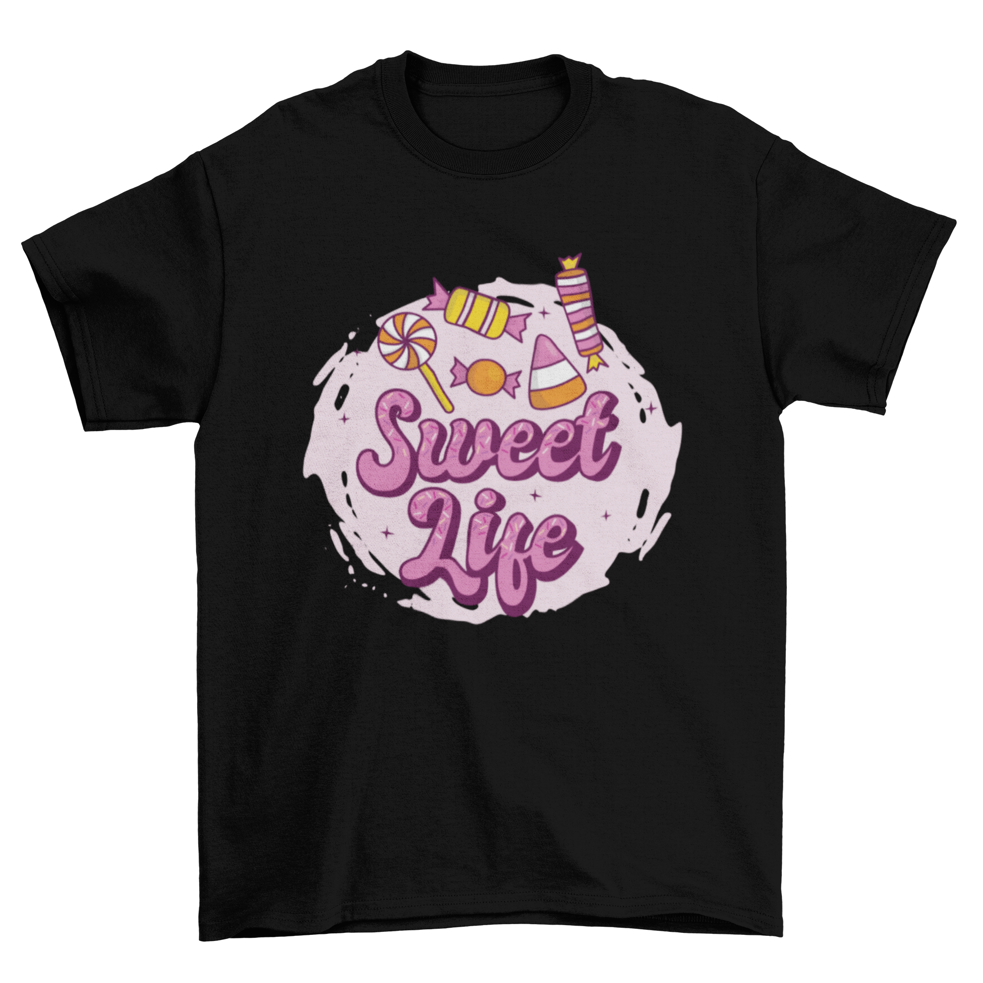 Cute t-shirt design featuring the quote "Sweet life" with candies around. Choose your color.